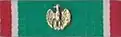 The ribbon is 32 millimetres wide, with a 3 millimetres wide red band, a 2 millimetres wide white band, a 22 millimetres wide dark green band, a 2 millimetres wide white band and a 3 millimetres wide red band.