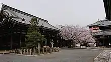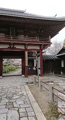 Honpō-ji was established in 1436[2] by Nisshin.[2] It was originally constructed in the Higashinotōin-Ayakōji (東洞院綾小路) area of the city,[2] but when Nisshin angered the shōgun Ashikaga Yoshimitsu and was imprisoned, the temple was destroyed.[2] Nisshin at last was pardoned in 1462, and rebuilt his temple at Sanjō-Marikōji in central Kyoto the following year, 1463. Nisshin's teachings thereafter gained a large following in Kyoto, and his temple, Honpō-ji, became a major head temple (honzan) in central Kyoto. After Nisshin's death, the Tenmon Hokke Rebellion of 1536 occurred in Kyoto, and all the Nichiren sect temples were destroyed. In 1542, however, Honpō-ji was rebuilt at Ichijō Horikawa-agaru, and in 1590, it was moved to its present location, at Ogawa Teranouchi-agaru in the Kamigyō-ku ward of Kyoto city. It was ravaged in the Great Tenmei Fire of 1788, and so, most of the current buildings are reconstructions dating from after 1788.[3]