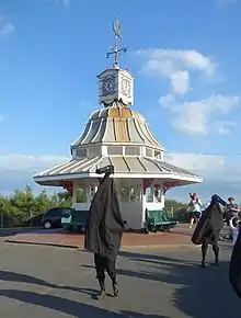 The anonymously authored account was repeated almost verbatim in a range of other publications in the coming decades, giving its description far wider exposure.[44] The first printed reference to the hooden horse having a wooden head appeared in Mackenzie E. C. Walcott's Guide to the Coast of Kent, published in 1859, where he referred to a "curious custom [which] used to prevail" in Ramsgate.[45] Maylam later suggested that the Ramsgate hooden horse tradition died out between 1807 and 1838, for he had interviewed elderly town residents in the early twentieth century and while several were aware that it had once taken place in the town, none could recall it happening in their own lifetime.[46]