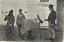 Maylam concluded that at the time, there was only one hooden horse still in active use in Thanet, that stored at Hale Farm in St. Nicholas-at-Wade, which he noted was brought out each Christmas to visit Sarre, Birchington, and St. Nicholas-at-Wade itself.[63] The members included a man in female garb, known as the Mollie, in their procession, but added that this had not been done for some time and was thus reintroduced for Maylam's benefit.[64] In his book, Maylam included a photograph of the horse taken at Sarre in 1905.[63] On Christmas Eve 1906, Maylam encountered a second hooden horse, this time at Walmer. This horse came into the local hotel tearoom at about 6.30 pm, accompanied by two musicians—one playing the tambourine and the other the concertina—and a man named Robert Laming who led the horse itself. They were wearing ordinary clothes, but informed Maylam that they had once worn smock frocks as part of the tradition. They had no Mollie, and the members could not recall a Mollie ever having been part of their custom. The hotel owner's daughter placed a gratuity in the horse's mouth, before the troupe moved on to the local shops, where they were also given gratuities in a similar manner.[65] Maylam talked to the troupe about the tradition, and eventually organised the photographing of the Walmer horse and those who accompanied it in March 1907.[65]