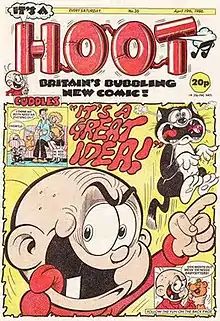 Hoot was a British comic magazine that ran from (issues dates) 26 October 1985 to 25 October 1986, when it merged with The Dandy. Its cover price was 20p, represented by a stylized graphic depiction of a 20p coin. Throughout its run, it billed itself as "Britain's bubbling new comic!", a reference to the title masthead being made up of steam-billowing pipes (hence the title). The comic was the last new humour anthology comic from DC Thomson which mostly featured original characters.