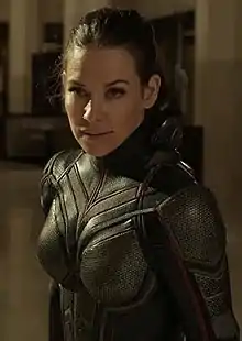The character Hope van Dyne first appeared in Ant-Man (2015).[4] Van Dyne is introduced in Ant-Man as the daughter of Hank Pym and Janet van Dyne and a senior board member of Pym Technologies who helps Darren Cross take over the company.[4][5][6][8] Throughout the film, character progression brings Hope closer to becoming a hero.[14] Lilly described her character as "capable, strong, and kick-ass", but said that being raised by two superheroes resulted in Hope being "a pretty screwed up human being [...] and the clear message sent by my name is that I'm not a big fan of my father and so I took my mother's name."[15] She added that Van Dyne's "arc in the movie is trying to find a relationship" with Pym.[16] Feige said that Van Dyne was the more obvious choice to take up the mantle of Ant-Man, being "infinitely more capable of actually being a superhero" than Lang, and that the reason she does not is because of Pym's experience with losing her mother, rather than sexism, which Feige felt would not be a problem for Pym in modern times.[13] At the end of the film during a mid-credits scene, Van Dyne is offered a prototype for a new suit from her father in which she notes that it's "about damn time".[17]