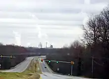 Smokestacks rise from Hopewell's skyline, seen from Chesterfield County