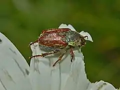 The adults of Hoplia argentea grow up to 9–12 millimetres (0.35–0.47 in) long. It is a very variable chromatic species. The body of these medium-sized flower-loving scarabs is covered with pale green, bluish-green or yellow ocher scales. The scales produce interference colors (as with butterflies). Old specimens lose most of the scales, changing their color from green to brown. Like other species of the genus Hoplia, it has fairly long hind legs terminated by a single nail. The legs in males are black with longer hind legs, while in the female they are reddish and the body colour is usually brown.[4]