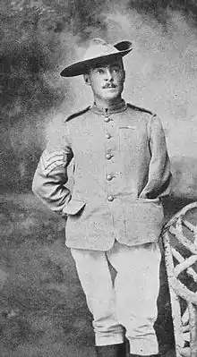 On the 26th December, 1899, during the fight at Game Tree, near Mafeking, when the order to retire had been given, Sergeant Martineau stopped and picked up Corporal Le Camp, who had been struck down about 10 yards from the Boer trenches, and half dragged, half carried, him towards a bush about 150 yards from the trenches. In doing this Sergeant Martineau was wounded in the side, but paid no attention to it, and proceeded to stanch and bandage the wounds of his comrade, whom he, afterwards, assisted to retire. The firing while they were retiring was very heavy and Sergeant Martineau was again wounded. When shot the second time he was absolutely exhausted from supporting his comrade, and sank down unable to proceed further. He received three wounds, one of which necessitated the amputation of his arm near the shoulder.[1]