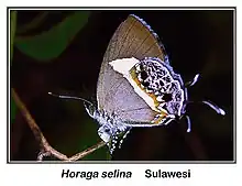 Horaga is a genus of butterflies in the family Lycaenidae which John Nevill Eliot, 1973,[1] places in the tribe Horagini of the subfamily Theclinae. The wings are blue, purple or brown above, with broad black costal and distal margins and usually a white discal spot on the forewing. The female is dingier than the male. The underside is ochreous, or ochreous brown, with a dark postdiscal line on both wings outwardly edged with white, this edging forming a broad white band not continued much above vein 6, on the forewing, but narrower and outwardly diffuse on the hindwing. The hindwing bears filamentous tails at veins 1b, 1 and 3 and, beneath. The pattern of H. araotina is aberrant.[2]