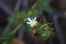 The inflorescence holds solitary and clustered flowers, each with toothed bractlets and thick, pointed sepals. There are five small white petals. Flowers bloom April to July.[1]