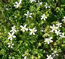 Horkelia parryi is a species of flowering plant in the rose family known by the common name Parry's horkelia.[2] It is endemic to California, where it grows in the chaparral of the Sierra Nevada foothills.[3] This is a low, mat-forming perennial herb growing in unobtrusive green patches on the ground. The leaves are 5 to 10 centimeters long and are each made up of small, toothed, oval-shaped leaflets. The somewhat hairy green to reddish-green stems are 10 to 30 centimeters (4 to 12 inches) long and bear inflorescences of a few flowers each. The flower has minute bractlets under larger, pointed sepals and five white petals. The center of the flower contains a ring of stamens around a patch of up to 50 thready pistils.