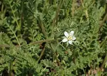 Horkelia rydbergii is a species of flowering plant in the rose family known by the common name Rydberg's horkelia. It is endemic to the Transverse Ranges of southern California, where it grows in several types of habitat, including pine forest. This is a perennial herb producing a low mat of hairy, glandular gray-green foliage around a woody base. The leaves are mostly flat and made up of pairs of hairy, wedge-shaped leaflets with toothed tips. The inflorescence is an open array of up to 40 flowers atop an erect stalk, each flower made up of five pointed green sepals and five white petals. At the center of the flower is a cone of 10 stamens around a bunch of up to 50 pistils.