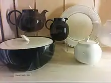 In the mid-1950s, the Rawson brothers started to recognise the potential of Philip's son, John Clappison, a student at Hull College of Art who produced the stylish, contemporary Elegance range of wares which are much in demand with collectors today.[2] In 1954, the business moved to the site of the defunct Hornsea Brick and Tile Works. At this time the Pottery also employed other noted designers such as Dorothy Marion Campbell and Alan Luckham as modeller. In 1967, the factory started to produce full ranges of tableware, the first being the John Clappison-designed Heirloom, followed by his Saffron and Bronte patterns. In the 1970s, the Queensbury-Hunt partnership became involved in Hornsea tableware design, and their Contrast and Concept ranges proved popular.[3] Though innovative, these products were not always practical in use. By 1974, the Edenfield Works employed 250 people and turned out three million pieces a year.[4]