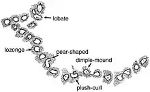Comparisons of different fossils in the same locations suggest that it rearranged itself into fewer but larger main masses as the sediment grew deeper round its base.[2] It may also have had a series of holdfasts along the bottom of the thread. Dimple marks in offshore sandstone have been found in the same deposits as Horodyskia, suggesting that they may be remnants of older holdfasts.[3] Thin sections of Horodyskia have revealed a system of tubes within the beads, including connecting strings, and other tubes radiating outward from each bead. Partial burial and branching of these tubes suggest that it may have had a benthic sessile lifestyle. Members of the genus are distinguished by bead size and spacing, with the beads of H. moniliformis being larger and more spaced than H. williamsii.[1]