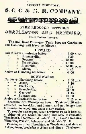 In order to divert traffic going by river to the more accessible port at Savannah, the South Carolina Rail Road was completed from Hamburg to Charleston in 1833. At 136 miles (219 km) in length, this was at the time the longest railroad in the world, and ran on published regular schedules with the exclusive use of steam power (Brown 1871 and Fetters 2008).