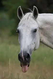 The mechanical functions of the horse tongue remain moderate, due to its prehensile and neigh functions.[8] The front part of the tongue, in conjunction with the incisors and lips, can grasp vegetable food.[3] In particular, the tongue enables the horse to bring food in grain form to its molars.[10] Horses can also partially clean their teeth with their tongue, dislodging stuck food.[3] The horse's tongue is sensitive to pressure, pain and temperature.[3]