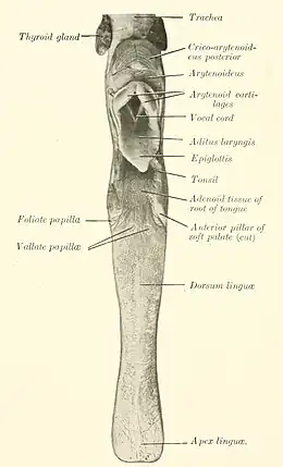 The horse tongue is covered with taste buds scattered over the entire back surface,[5][6] mainly on the first two-thirds of the tongue.[7] Most of these taste buds have no gustatory function, only mechanical and/or tactile.[6] Taste buds are therefore in the minority.[6] Filiform taste buds are present on the dorsal and lateral parts of the tongue, but not on the ventral part.[8] Their appearance is short and thin, with a general finger-like shape and terminations of variable form.[8] Their very fine keratinized thread protrudes from the surface and is curved backwards.[5]