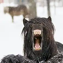 Chewing is a combination of licking and mastication, during which the mouth is open and the tongue clearly visible, causing the horse to secrete saliva.[21] This behavior can have many reasons and meanings, including submission, relaxation or well-being, but also discomfort.[21] In its natural state, a horse chews when waiting for its turn to drink, when standing up and expressing relaxation after a rest, but also to soothe and show submission to a fellow horse.[21] When relaxed, the horse may chew with light chewing movements.[23] However, the horse may also yawn, chew and shake its head during ambivalent behaviors resulting from behavioral disorders.[24]
