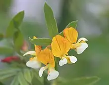 Hosackia oblongifolia, synonym Lotus oblongifolius, is a species of legume native to western North America from Oregon to northern Mexico.[1] It is known by the common name streambank bird's-foot trefoil or meadow lotus. It grows in moist to wet areas in several types of habitat. It is a spreading or upright perennial herb lined with leaves each made up of 3 elongated oval leaflets each up to 2.5 centimeters long. The inflorescence bears several yellow and white flowers between 1 and 2 centimeters long. The fruit is very elongated, reaching up to 5 centimeters in length but just a few millimeters in width.