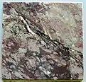 Hotavlje is best known for its stone quarries, which started operating in the mid-19th century.[5] Cordevolian limestone[6][7] (marketed as Cordevol limestone, also referred to as hotaveljski marmor 'Hotavlje marble') is a greyish-pink and red mineral. It has an attractive mottled appearance with irregular patches of grey, opaque yellow, or scarlet dolomite in small rhomboid crystals, white and coloured calcite veins, and frequent remnants of fossilised algae. Its colour and the high gloss of its polished surface make it a popular material and it was traditionally used in buildings in the area. It is quarried by the local company Marmor Hotavlje, which employs 150 workers and over the years has developed into one of Slovenia's leading stone-cutting companies, using the local quarries to the north of the settlement as well as travertine and tuff quarries in Jezersko and limestone breccia in Bosnia and Herzegovina. The marble is also used for restoration work in registered buildings. The replica of the Robba Fountain in the main town square in Ljubljana was made by the company and it has supplied cut and carved marble to projects abroad such as the Saint Sava's Church in Belgrade.[8]