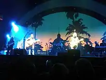 Eagles performing "Hotel California" in 2010 with the image from the album cover in the background