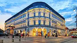 Situated along the Royal Route, the building was designed by Polish-Italian architect Enrico Marconi and has since been one of Warsaw's architectural symbols. Badly damaged during World War II, it was systematically rebuilt at a great expense throughout the 1950s, reopening as a hotel in 1962. Managed by Raffles Hotels & Resorts, it reopened on 1 June 2018 after extensive renovation[2] with 106 rooms, restaurant, bar, spa and Lourse pâtisserie, as well as offices on the top two floors and a luxury shopping center.