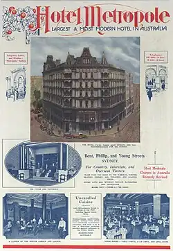 - ↑ "Hotel Metropole, Sydney". The Catholic Press. New South Wales, Australia. 13 September 1928. p. 63. Retrieved 23 July 2023 – via National Library of Australia.