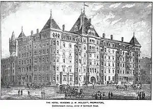 The Vendome was a luxury hotel built in 1871 in Back Bay, just north of Copley Square. A massive expansion was undertaken in 1881 according to plans by architect J. F. Ober and completed in 1882.[1]