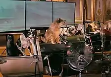 The next phase of training involved using the dogs' body language to express emotions: sadness, for example, was conveyed when a dog tucked its tail between its legs. Finally, the dogs were taken to public places to review the commands that they had learned. The purpose of this was to ensure that the dogs would perform in any location. According to Forbes, "You want the dogs to sense that everything is fine and they'll still get their treat regardless of the location. The set becomes just another place for them to go."[16] The trainers worked with the human actors as well to "familiarize them with how the dogs behave and create a comfort level between the human and the dog actors."[16] The dogs were also trained to interact with the various gadgets in the film with early prototypes built by the special effects team.