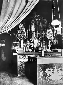 The buildings are marked off from the street by an ornamental picket fence and gate which have been reconstructed from photographs and archaeological investigation. The temple building is fronted by a pagoda consisting of the upper section of the original roof mounted on a new base. Inside, the space is divided into an entrance area separated by doors from the area which contains the altar and a heavenly well. This is a section of raised pagoda roof which is designed to admit light and to allow incense to rise from the large burner below. It is glazed to keep out rain and is supported on posts which display a deliberate irregularity to symbolize human imperfection.[1]