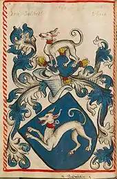 German heraldry distinguishes three variants of dogs: Windhund (greyhound), Bracke and Rüde (also Dogge).[4]