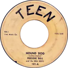 On March 7, 1953, "Hound Dog" was advertised in Billboard, and reviewed positively on March 14, 1953, as a new record to watch, described as "a wild and exciting rhumba blues" with "infectious backing that rocks all the way".[46] According to Johnny Ace biographer James M Salem, "The rawness of the sound combined with the overt sexuality of the lyric made 'Hound Dog' an immediate smash hit in urban black America from late March to the middle of July 1953."[47] "Hound Dog" takes off immediately and looks like a national hit record. Rufus Thomas quickly records an answer song called "Bear Cat" on Sun 181. Thornton's record is such a big seller that Peacock Records has three new pressing plants running full-time to try and keep up with demand.[48] Debuting in the charts on March 28, 1953,[26] it spent fourteen weeks on the Billboard Rhythm and Blues charts,[49] seven of them at number one.[50] By April 30, 1953, Cash Box magazine listed the song as "the nation's top-selling blues record", and it topped the charts in New York, Chicago, New Orleans, San Francisco, Newark, Memphis, Dallas, Cincinnati, St. Louis, and Los Angeles.[51] "By mid summer, it is obvious that "Hound Dog" will be the biggest seller in the history of Peacock Records."[48] The song was named as the Best Rhythm and Blues song of 1953 by Cash Box magazine,[6] and was ranked number three on Billboard's Best Selling Rhythm & Blues Chart for 1953.[52]