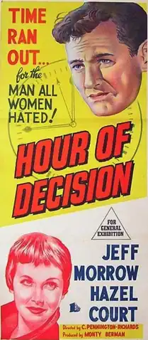 Hour of Decision is a 1957 British mystery film directed by C. M. Pennington-Richards and starring Jeff Morrow, Hazel Court and Anthony Dawson.[1] It is based on the novel Murder in Mayfair by Frederic Goldsmith.