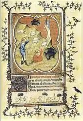 Artists involved in the creation of the hours include Master of the Bible of Jean de Sy (fr), Master of the Grandes Heures, Master of the Throne of Mercy, Master of the Coronation Book of Charles V with assistance from Willem Vrelant, Jean Le Tavernier, Dreux Jean (fr) and others.[1] Flemish artist Alexander Bening is thought to have contributed to the hours in the fifteenth century.[3] He was the first artist to illustrate borders with realistic depictions of flowers, jewels, and animals.[3] Two artists are responsible for the miniatures of Philip's prayerbook.[1] Eric Millar identified the likely artist who painted the calendar scenes and ten of the eleven large miniatures as the Boquetaux Master.[2] However, another artist, possibly a close follower of the Boquetaux Master's circle, is also speculated to have painted the calendar scenes and ten of the eleven large miniatures.[2] The second artist of the manuscript is less skillful, but they come from the same workshop.[2] The Boquetaux Master's name derives from the grouped parasol-like trees which are a prominent element of his work.[2] His bas-de-pages which consist of quadrilobed frames around the miniatures and little scenes painted at the bottom of the page are also distinguishable features of his work.[2] The Annunciation to the Shepherds miniature displays examples of the Boquetaux Master's little spinneys or small thickets.[2]
