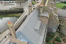 The south facade of the House Mill displays a coat of arms dated 1776 and the initials "D S B" (which could be Daniel and Sarah Bisson), with forty cast iron wall plates which tie the ends of the floor beams.