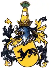 The family coat of arms depicts a black wolf couchant on a gold field. On the crowned helm is a red column with an embedded gold mirror, bedecked with nine natural peacock feathers. The mantling is black and gold.