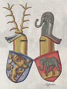 The House of Helfenstein used an elephant on their coat of arms. According to one source, the elephant is a type of Namenwappen (German: Coat of Arms from a name), in this case Helfenstein became Elefanten or elephant because of similarity between the sounds.[1] A more fanciful source claims that the elephant comes from the first ancestor of the family, Helfrich, a citizen of Rome in 225 AD, a captain of the 5th Legion of Veterans based in Germany and the Lord of the Fils River. Helfrich acquired an elephant for his coat of arms. Their emblem depicted an elephant and was awarded in 46 BC for bravery against a charge of elephants in the Battle of Thapsus. Known locations for leg V Alaudae. Chapter One: The Counts von Helfenstein]</ref> from the Legion's emblem.