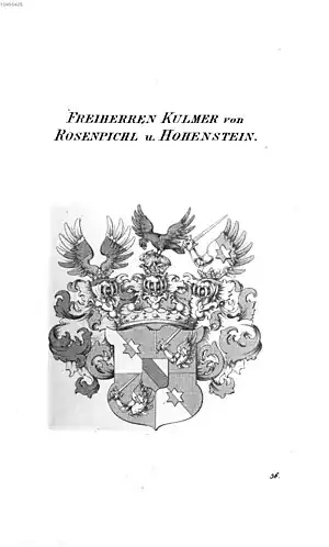 The House of Kulmer is a noble family originating in the Duchy of Carinthia. The family ancestry is traced back to the 14th century under names of Kulmer and von Münzenbach. Georg Kulmer (?–1567) had the Rosenbichl Castle built near Klagenfurt, while his brother Hermann Kulmer (?–1546) built the Hohenstein Castle near Sankt Veit an der Glan. Johann Balthasar Kulmer (?–1683) was awarded the title of baron in 1654 and the title of von Rosenpichl und Hohenstein. His three sons, Georg Ferdinand (1638–1706), Christoph Andreas, and Ferdinand Ernst are deemed the progenitors of the Carinthian, Styrian and Croatian branches of the family respectively.[1]