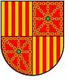 The first, of the Fernández de Híjar , shows the fusion of the lineages of Aragon and Navarra. In the shield of Pedro Fernández de Híjar (the bastard son who King Jaime I of Aragon had from Doña Isabel Berenguela Fernández, granddaughter of the King of Navarra) we can see the five golden vertical bands alternated by four red vertical bands (de cuatro palos gules) symbol of Aragon and the golden chains, symbol of Navarra, framed and cross-shaped with, in the middle, an emerald on a red background.