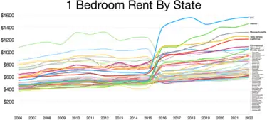1 bedroom rent by year by State. 2015 divergence could be from minimum wage increases or the 2014-2015 oil price crash.