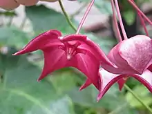 It has oval pointed leaves and has a twining growth habit. The flowers of the plant are approximately 6 cm in diameter and vary slightly in size, shape, and color from each cultivar. They come in umbels of 6 to 10 flowers that are each connected at a central axis. Each flower is a dark burgundy color with five sepals and five petals. The stamen are enclosed in the corona. The fruit produced are two pairs of follicles that are 25 cm long from which a flat seed is produced that is distributed by the wind. The seed takes a long time to germinate.