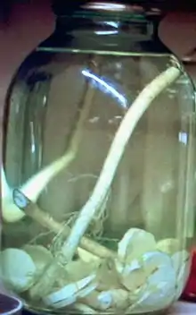 This practice is an ancient tradition. At the beginning of the 18th century, a decree was issued that every farmstead must produce vodka.[2][3][4] The word "hrenovuha" refers to the common parlance and is not recorded in dictionaries.[5] Nevertheless, horseradish alcohol is served under this name in many restaurants.[6][7][8][9] The Moscow plant KIN1 produces this beverage.[10]