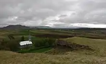 A view from a hill overlooking the Lutheran church at Hruni, Iceland.