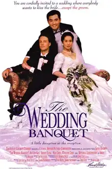 The Wedding Banquet[3] is a 1993 romantic comedy film directed, produced and co-written by Ang Lee. The story concerns a gay Taiwanese immigrant man (played by Winston Chao, in his film debut) who marries a mainland Chinese woman (May Chin) to placate his parents (Gua Ah-leh and Lung Sihung) and get her a green card. His plan backfires when his parents arrive in the United States to plan his wedding banquet and he has to hide the truth of his gay partner (Mitchell Lichtenstein). It was a co-production of Lee's Good Machine production company, and the Taiwanese Central Motion Picture Corporation.