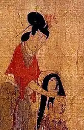 According to the Youyang zazu (酉陽雜俎), women in the Tang dynasty painted huazi (Chinese: 花子) on their face, which originated from Shangguan Wan'er.[11] According to the Chinese folk legend, the red plum blossom huadian became popular in the Tang dynasty under the influence of Shangguan Wan'er. Shangguan Wan'er had her face ruined by Wu Zetian with a scar on the forehead, and as a result, she tattooed a red plum blossom around her scar and dyed it red taking inspiration to the plum blossom makeup created by Princess Shouyang.[16] The red plum blossom not only covered her scar but also made her look more beautiful and charming, which in turn made the makeup popular from the palace ladies to the common folk turning it into a representative makeup of the Tang dynasty.[16] This became known as Hongmei zhuang (Chinese: 紅梅妝; lit. 'Red Plum Makeup').