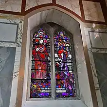 Hubert McGoldrick worked consistently at An Túr Gloine from when he first joined in 1920 until 1943 when the artist and unofficial manager, Sarah Purser, died and reluctantly the two remaining artists, McGoldrick and Catherine O'Brien, decided to dissolve the cooperative studio; thereafter McGoldrick produced little stained glass. His first window, Sorrow and Joy, for Gowran, County Kilkenny, indicates a strongly developed personal style and choice of palette which would have been quite at variance to the prevalent house-style at Earley and Company from where he had come. Like Harry Clarke and Michael Healy he revelled in rich detail, particularly evident in his works of the 1920s. One of his finest windows was produced early in his An Túr Gloine career, The Sacred Heart appearing to Saint Margaret Mary,[4] (1925) for St Brendan's Cathedral, Loughrea,[5] County Galway; already by the mid 1920s this cathedral was well on its way to becoming a showcase for work by all but one (Wilhelmina Geddes) of the significant artists that worked at An Túr Gloine — and the Irish arts and crafts movement generally — and McGoldrick may well have recognised its potential as a premium venue to display his artistry. This window revels in warm colours and features little vignettes.