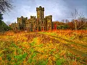 Near Criccieth in Gwynedd are the ruins of Plas Gwynfryn, a 19th-century "stone mansion with castellated towers and turrets and stone-mullioned windows" mansion built by Hugh Ellis-Nanney. He had demolished his existing manor house (c. 16th century) and rebuilt a new family residence c. 1870s.[19][20]The location of Gwynfryn is on the Llŷn Peninsula overlooking Wales' highest mountain range, Snowdonia (Eryri) with views of Cadair Idris, and also to the south, Cardigan Bay. The land was a 12,072-acre estate in 1873, and the annual rental income was £5,814.[21][22] Designed by George Williams from London, the mansion was constructed over 10 years between 1866 and 1876, its total cost was £70,000 (equivalent to £7,000,000 in 2021).[6][23][16] The mansion was featured in the June edition of The Builder magazine in 1877.[22][24]