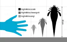 Four years later, a second species was discovered among the fauna of the Shawangunk grit at Otisville. It was described as Hughmilleria shawangunk and was smaller than H. socialis.[3] The temporal range of H. shawangunk has been placed between the Llandovery and Ludlow epoch.[1] The largest specimens measured 12 cm (5 in) in length,[2] and differ from the type species by the carapace, which was broader, and the compound eyes which were larger and more prominent than the eyes of H. socialis, among other aspects.[3]