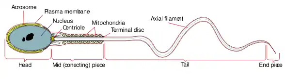 The size of the sperm midpiece is determined in part by the volume of mitochondria in the sperm.[17] Sperm midpiece size is tied to sperm competition in that individuals with a larger midpiece will have more mitochondria, and will thus have more highly motile sperm than those with a lower volume of mitochondria.[17] Among humans, as with relative testis size and ejaculate volume, the size of the sperm midpiece is small compared to other primates, and is most similar in size to that of primates with low levels of sperm competition, supporting the theory that humans have had an evolutionary history of intermediate levels of sperm competition.[5]