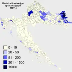 Hungarians are a recognized ethnic minority in Croatia. According to the 2011 census there are 14,048 people of Hungarian ethnicity living in Croatia (or 0.33% of total population).[2] Around two thirds of them (8,249) live in Osijek-Baranja County in eastern Croatia, especially in the Croatian part of the Baranya region which borders Hungary to the north.[3] There are also small Hungarian communities in other parts of the country, including areas in Bjelovar-Bilogora County in central Croatia where 881 people identify themselves as Hungarian.[3]
