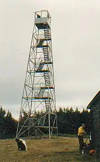 A wooden fire tower had been in existence at the summit since the state's Forest, Fish and Game Commission built it in 1909, during Fenwick's logging operations, but once those ended it was replaced by a steel one in 1917, then the current one in 1953. At that time, the location of the tower was changed from a smaller clearing 0.2 miles (0.32 km) east of the summit to its current location. The footings at this location, a trail junction, are still visible and sometimes cause confusion as to whether this is, in fact, the mountain's actual summit.