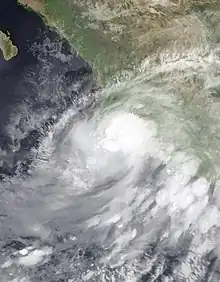 Throughout the morning of June 21, Beatriz brushed the coast of Mexico, with the center passing roughly 15 mi (20 km) south-southeast of La Fortuna, Mexico.[13] Centered just off the coast of Mexico, the system interacted with land and began weakening.[14] Hours later, convection rapidly diminished as dry air became entrained in the circulation. In response to quick degradation of the system's structure, the NHC downgraded Beatriz to a tropical storm.[15] Rapid weakening continued throughout the day and by the evening hours, the storm no longer had a defined circulation. Lacking an organized center and deep convection, the final advisory was issued on Beatriz.[16] The storm's remnants persisted for several more hours before dissipating roughly 175 mi (280 km) southwest of Cabo Corrientes, Jalisco.[17]