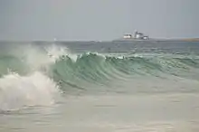 Though Bertha remained hundreds of miles offshore, long-period swells resulted in dangerous rip currents across the East Coast of the United States.[52] Two people required rescue off the coast of Jacksonville, Florida due to rip currents.[53] Lingering swells resulted in the drowning of a man at Mickler's Landing in Ponte Vedra Beach.[54] Further north near Cape Hatteras, North Carolina, a man was pulled out to sea by rip currents and rescued by the Hatteras Island Rescue Squad; however, after being hospitalized he later succumbed to his injuries and died.[55] Tropical storm warnings were raised for offshore zones; waves of 15 to 25 ft (4.6 to 7.6 m) were forecast for areas off the Delmarva Peninsula and New Jersey.[56] Several people were injured in rough seas at Rehoboth Beach, Delaware while lifeguards performed multiple rescues.[57] In Ocean City, New Jersey, 25 rescues took place on August 5.[58] That same day, a woman nearly drowned near Atlantic City after being pulled out by rip currents.[59]